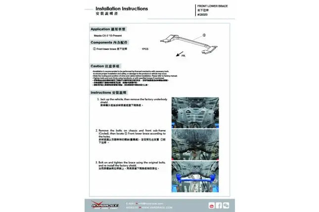 HARDRACE Front Lower Brace are designed to stiffen up the chassis and reduce vehicle chassis flex. This will increase the rigidity of your car during high speed driving and hard cornering. This is why HARDRACE Front Lower Brace can maximizes the performance of the suspension and brings better handling feeling and quicker response. . Tubular design to help reduce weight . Reduce the chassis flex . Increase the rigidity.