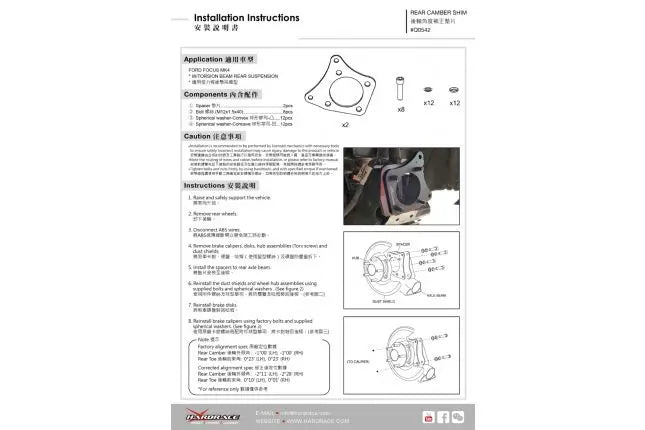 The OE rear torsion beam of FOCUS MK4 does not allow for any alignment changes. HARDRACE rear adjusting spacer can help you to reduce the rear toe degree easily. By replacing the factory caliper mounting bracket and install the rear adjusting spacer, it will correct the toe-in to normal of lowered car.