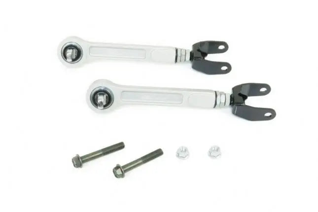 The adjustable arms allow fine adjustments to the rear end alignment setting of the vehicle. It can either help achieve desired handling characteristic or get your car back to original alignment specs after lowering. The arms are made of anodized CNC billet aluminum alloys to offer highest durability and strength. The equipped premium quality pillow ball bushings also provide more precise and solid handling response over the factory components.