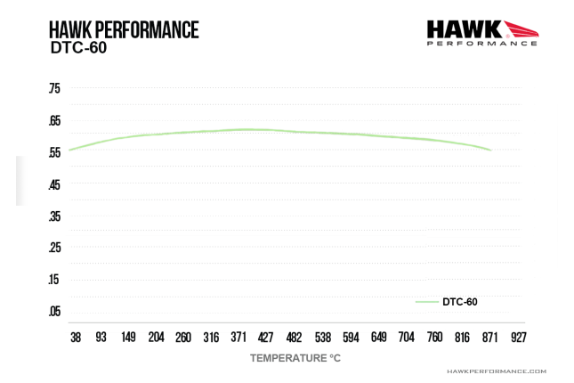 Hawk DTC-60 racing brake pads have the same temperature range as Hawk’s DTC-70, but produce less brake torque. Many racers of lighter, smaller cars often run DTC-60 pads on the front and DTC-30 pads on the rear while on larger, heavier, high performance or race cars, the DTC-60 is more often used on the rear with the DTC-70 up front. Operating temperatures: 205-870°C Optimal temperature range: 370-595°C