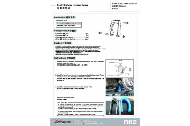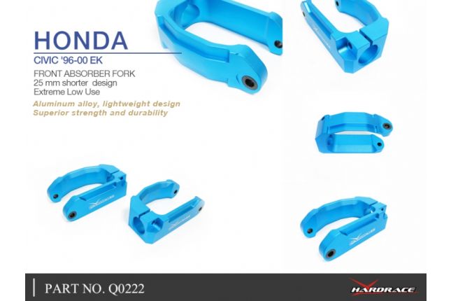 HARDRACE esiamortisaatori esihark on valmistatud alumiiniumisulamist, mis pakub ülimat tugevust ja vastupidavust. See on loodud asendama originaalkahvlit ja võimaldama amortisaatori komplekti 2,5–5 cm võrra madalamale langetada ilma vedrustuse eelkoormust muutmata. Pärast paigaldamist puudutab ratas peaaegu koobast. See on ohutu ja lihtne viis CIVIC EK sõidukõrguse langetamiseks.