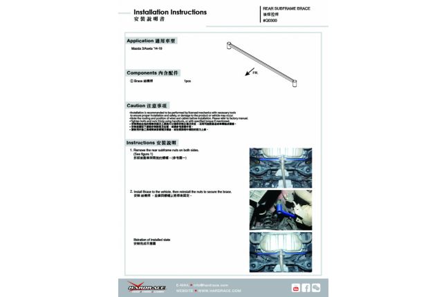 HARDRACE tagumise abiraami toed on loodud šassii jäigemaks muutmiseks ja sõiduki šassii painde vähendamiseks. See suurendab teie auto jäikust suurel kiirusel sõites ja järskudes kurvides. Seetõttu saavad HARDRACE tagumise abiraami toed maksimeerida vedrustuse jõudlust ning pakkuda paremat juhitavust ja kiiremat reaktsiooni.