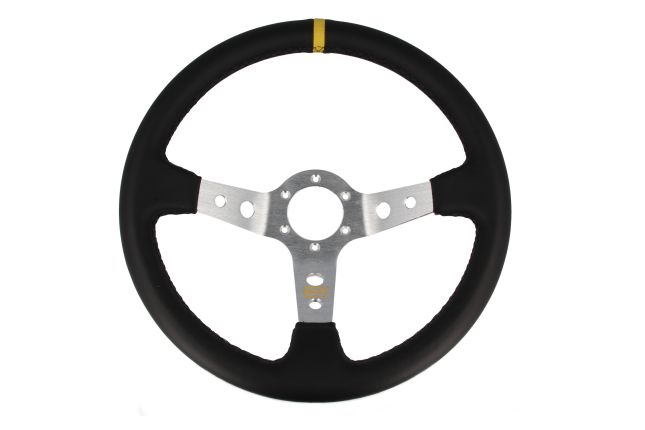 QSP Productsi nahkkattega sportrool. Selle sportrooli läbimõõt on 350 mm ja see on süvendatud kolme hõbedase anodeeritud alumiiniumist kodaraga. Lenkstangi sügavus on 90 mm, mis tähendab, et lenks on lameda lenksuga võrreldes 90 mm eespool. Sportrool tarnitakse koos signaali ja roolirõngaga.