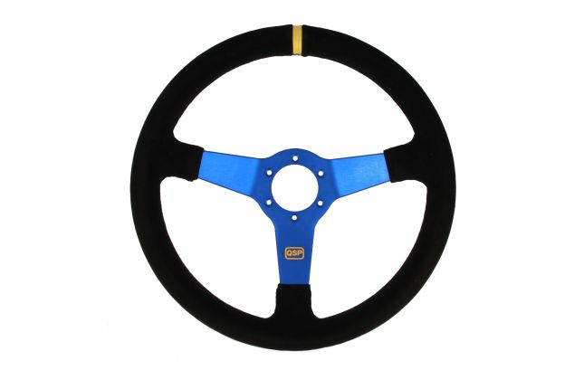 QSP Products'i seemisnahast sportrool. Selle sportrooli läbimõõt on 350 mm ja seda on süvendatud 3 sinise anodeeritud alumiiniumist kodaraga. Rooli sügavus on 70 mm, mis tähendab, et rool on 70 mm võrra ettepoole nihutatud võrreldes tavalise rooliga. Sportrool tarnitakse koos signaaliga ja roolirõngaga.